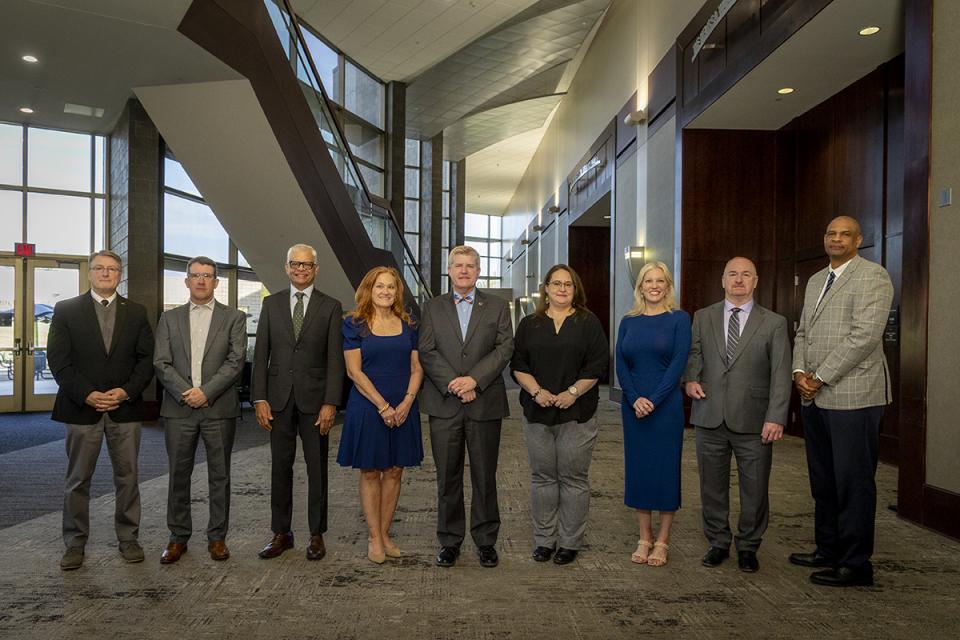 Brian Boehmer, superintendent of facilities and support services; David Brillhart, EdD, vice president for business and finance; Sanath Kumar, PhD, director of marketing and public relations; Jacqueline Parrill, EdD, vice president and chief of staff; John M. Berry, PhD, president; Sarah Morrison, dean of enrollment management; Kim Manno, JD, director of advancement; Greg Ferenchak, PhD, provost; John Davenport, PhD, dean of students